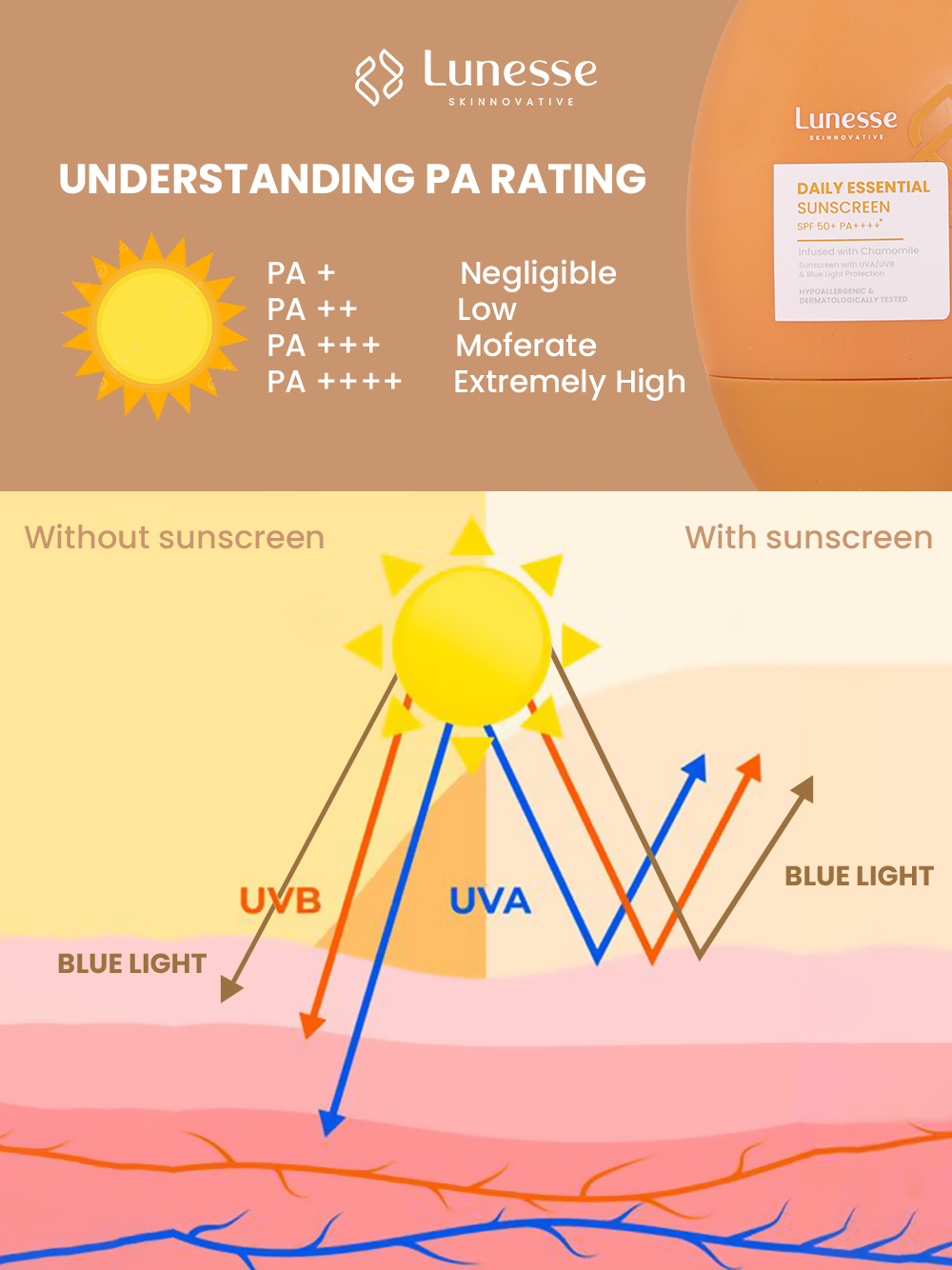 Tahukah kamu? SPF 30 bisa melindungi sekitar 97% sinar UVB, sementara SPF 50 bahkan lebih tinggi lagi — itulah sebabnya Lunesse Daily Essential Sunscreen SPF 50+ PA++++ jadi andalan banyak orang. Teksturnya ringan, cepat meresap, dan cocok untuk iklim tropis.