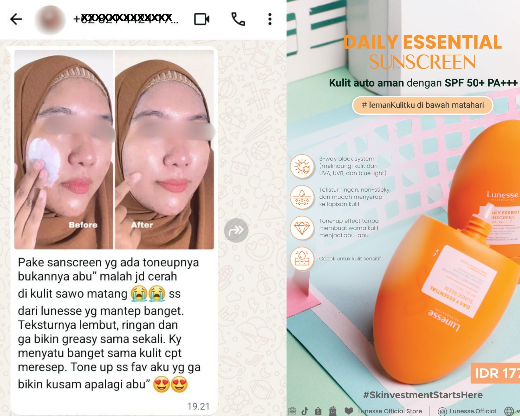 Dalam testimoninya, customer membagikan pengalaman sebelum dan sesudah menggunakan sunscreen Lunesse. Hasilnya, kulit tampak lebih cerah dan segar secara natural tanpa kesan abu-abu.