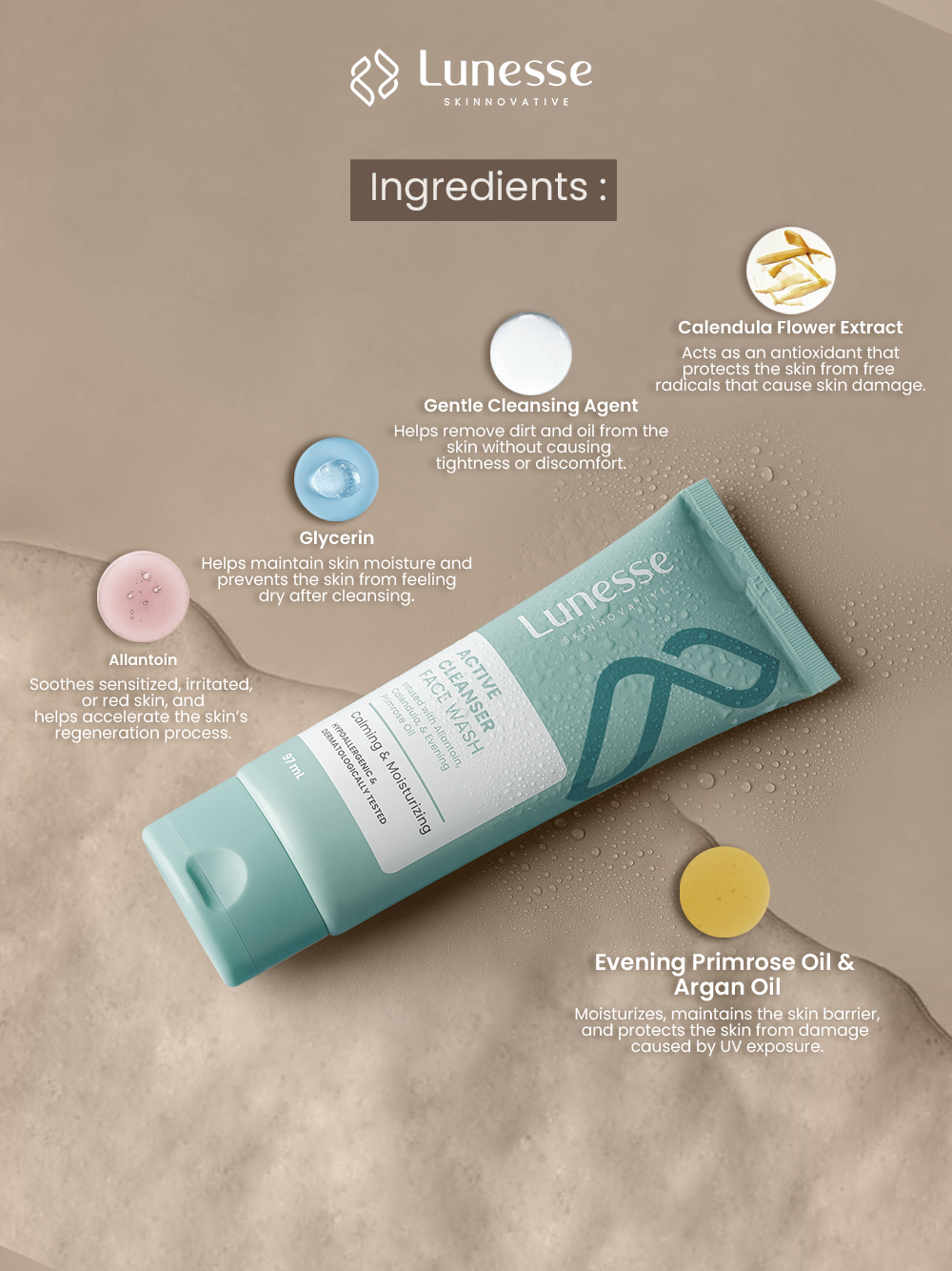 Lunesse Active Facewash adalah contoh pembersih yang lembut tapi efektif mengangkat kotoran dan minyak tanpa mengganggu kelembapan alami kulit. Cocok untuk semua jenis kulit, termasuk yang sensitif.
