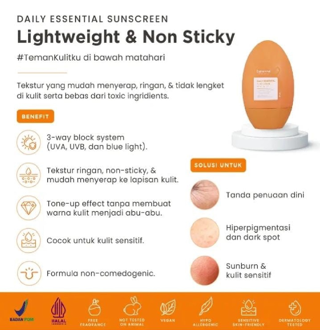 Manfaat dari penggunaan Lunesse Skinnovative Daily Essential Sunscreen meliputi: tidak menyumbat pori-pori, membuatnya cocok bahkan untuk pengguna dengan kulit sensitif.