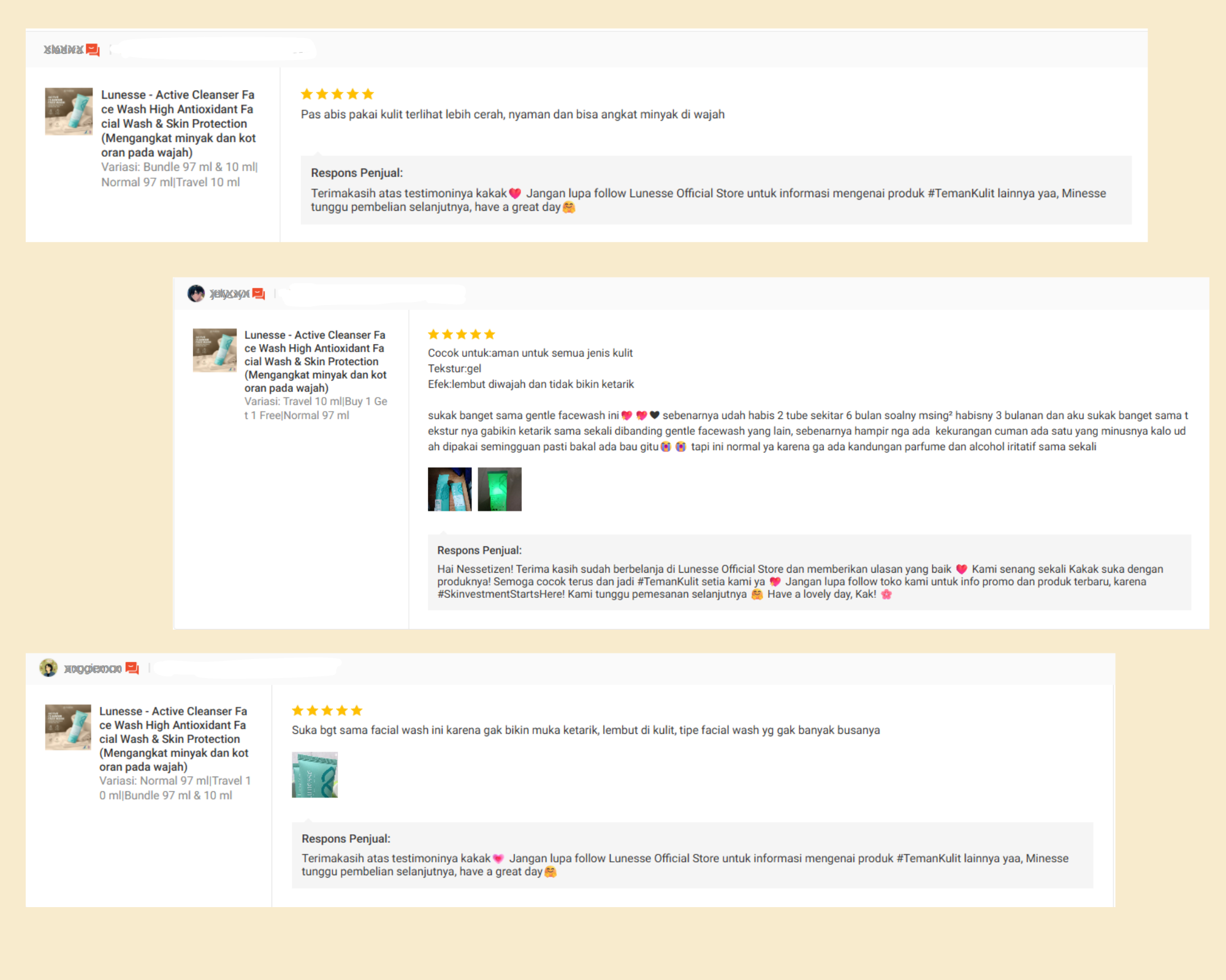 Tidak sedikit pengguna yang mengaku telah menghabiskan lebih dari satu tube karena merasa puas dengan hasilnya. Ini menjadi bukti bahwa Lunesse Active Cleanser Face Wash bukan hanya dicoba sekali, tetapi benar-benar menjadi bagian dari skincare routine harian.