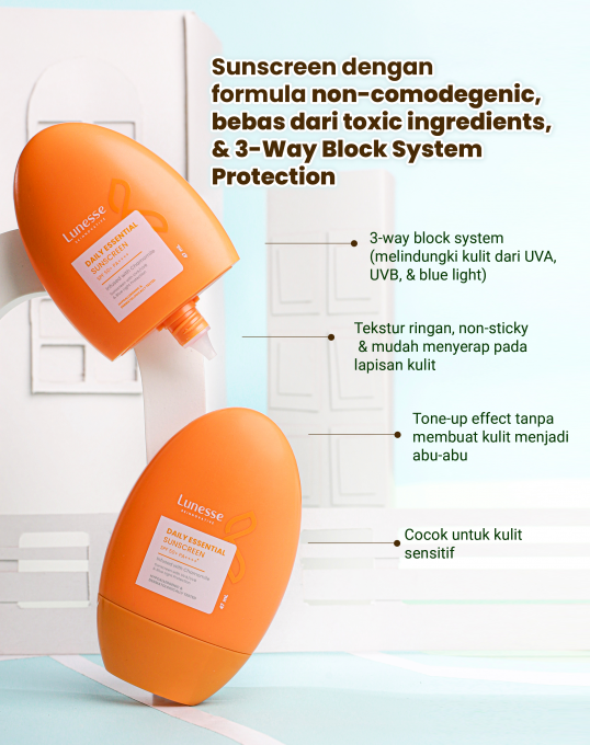Daily Essential Sunscreen dengan formula non comedogenic yang cocok digunakan bahkan untuk kulit sensitif dengan sistem blok 3 arah (melindungi kulit dari UVA, UVB, dan blue light) serta tekstur yang mudah menyerap, lightweight, dan tidak lengket di kulit serta bebas dari bahan-bahan beracun dan berbahaya.